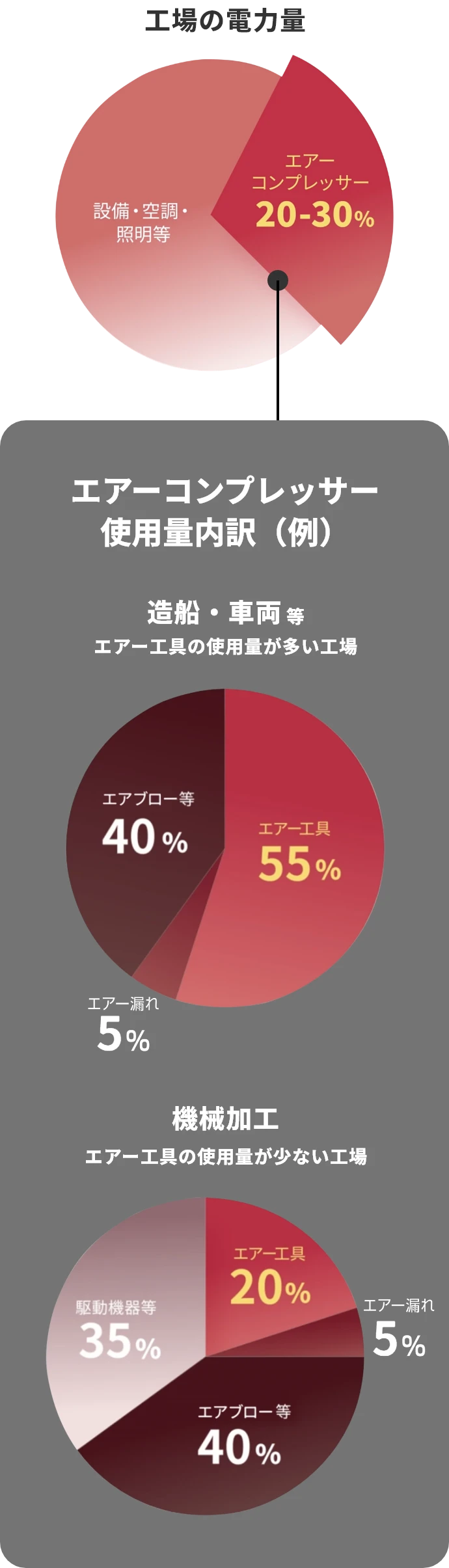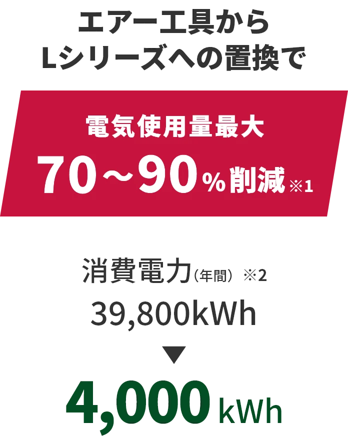 工場の電力量の約20~30%をエアーコンプレッサーが占めており、Lシリーズに置き換えると電力使用量の大幅な削減が可能で、より経済的な選択になります。最大90%の省電力を実現。