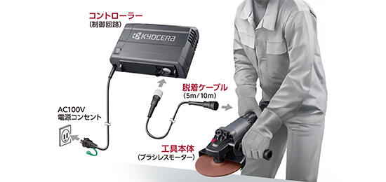 Lシリーズは、金属加工業の生産性向上に貢献する新たなツールとして高い評価を得ています。ブラシレスモーターの制御回路を工具本体から切り離し、コントローラーに集約することで、「コントローラー」「脱着ケーブル」「工具」の3ユニット構成を実現しました。この独自構造により、従来の高周波工具、電動工具、エアー工具が抱えていた「重さ・大きさ」の課題を解消するとともに、高出力化を実現した次世代ツールです。